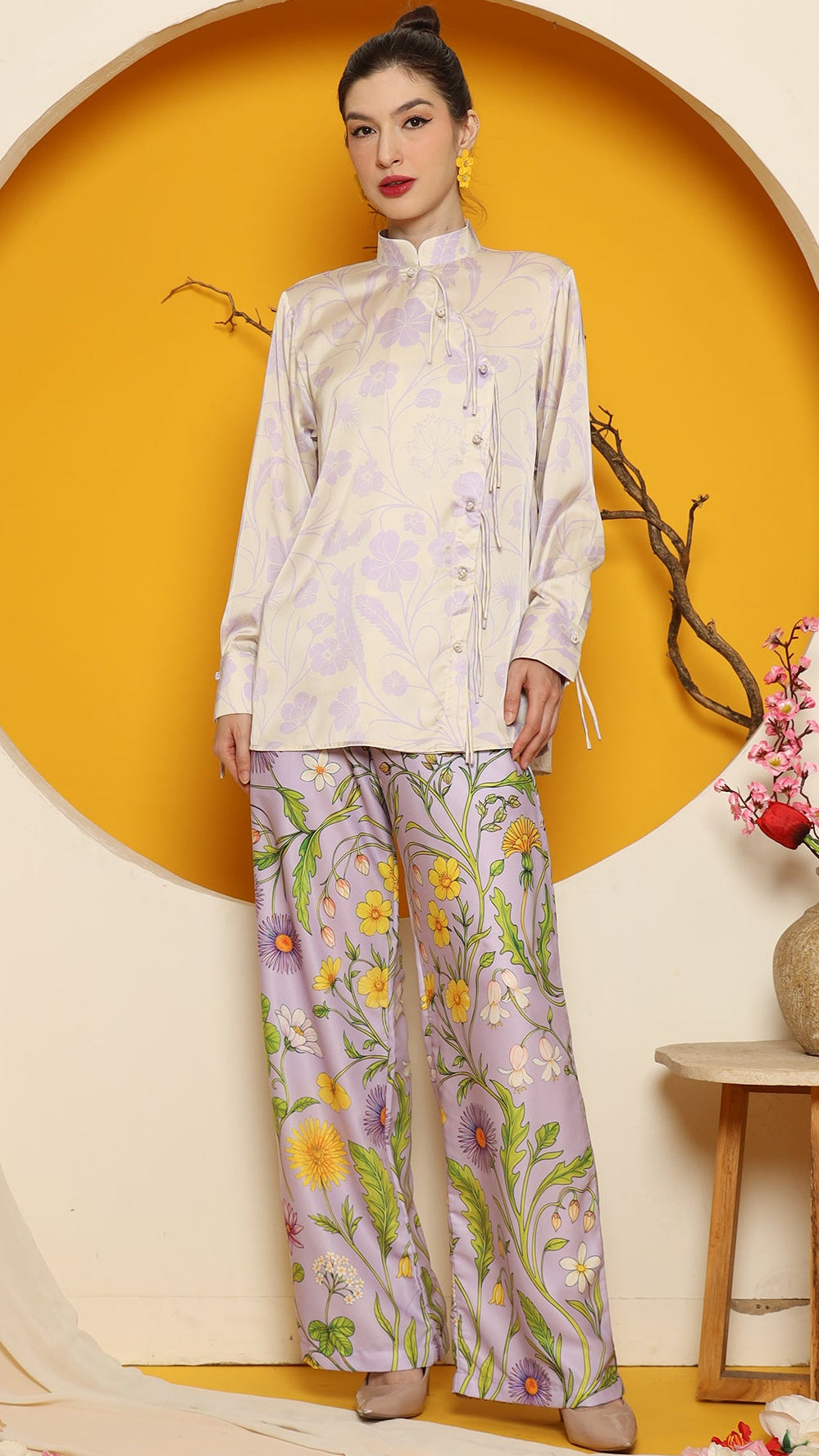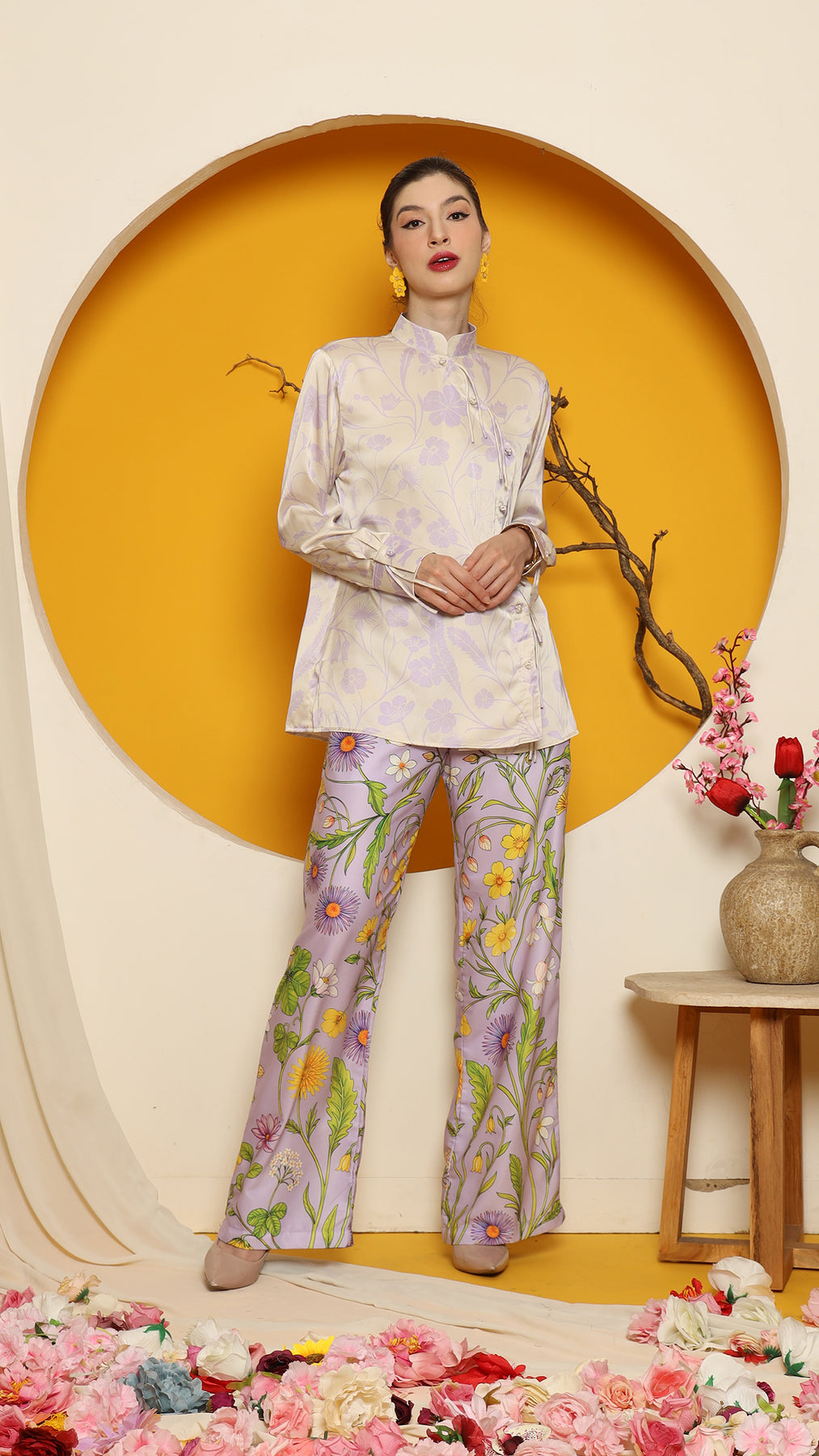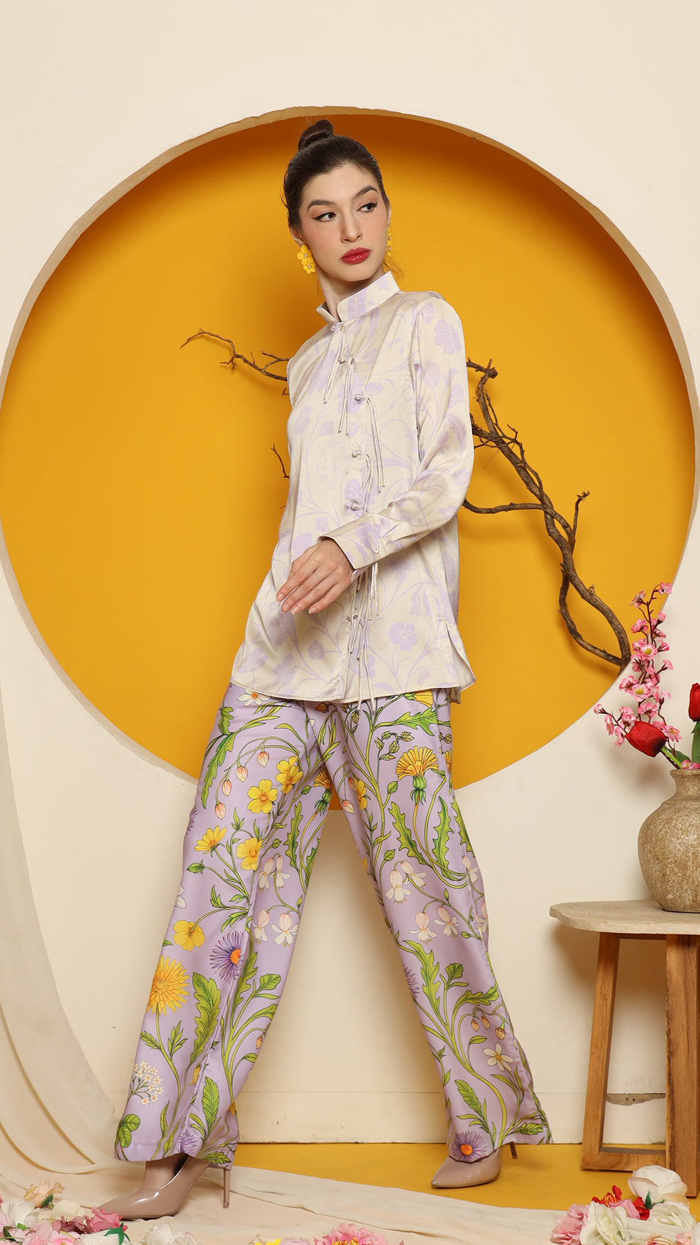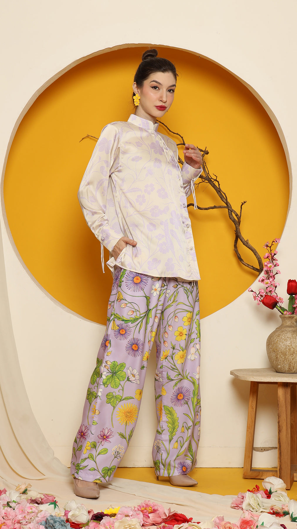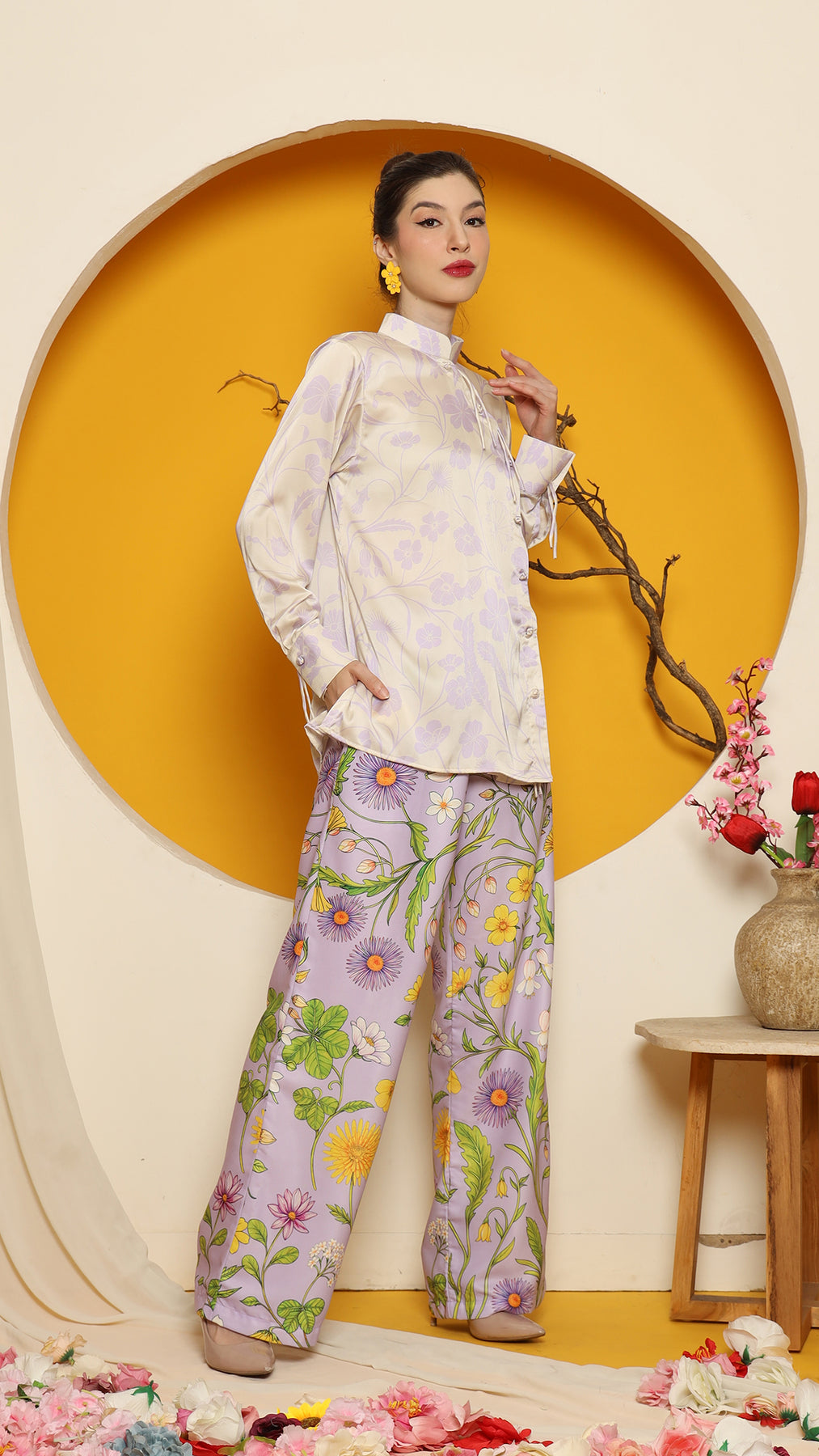 This refined ensemble includes cheongsam long top, showcasing an elegant flower motif. The shirt features a clean, minimalistic design perfect for a timeless look. Paired with it is a premium satin pants adorned with floral patterns