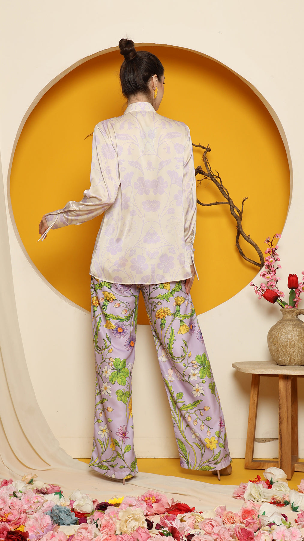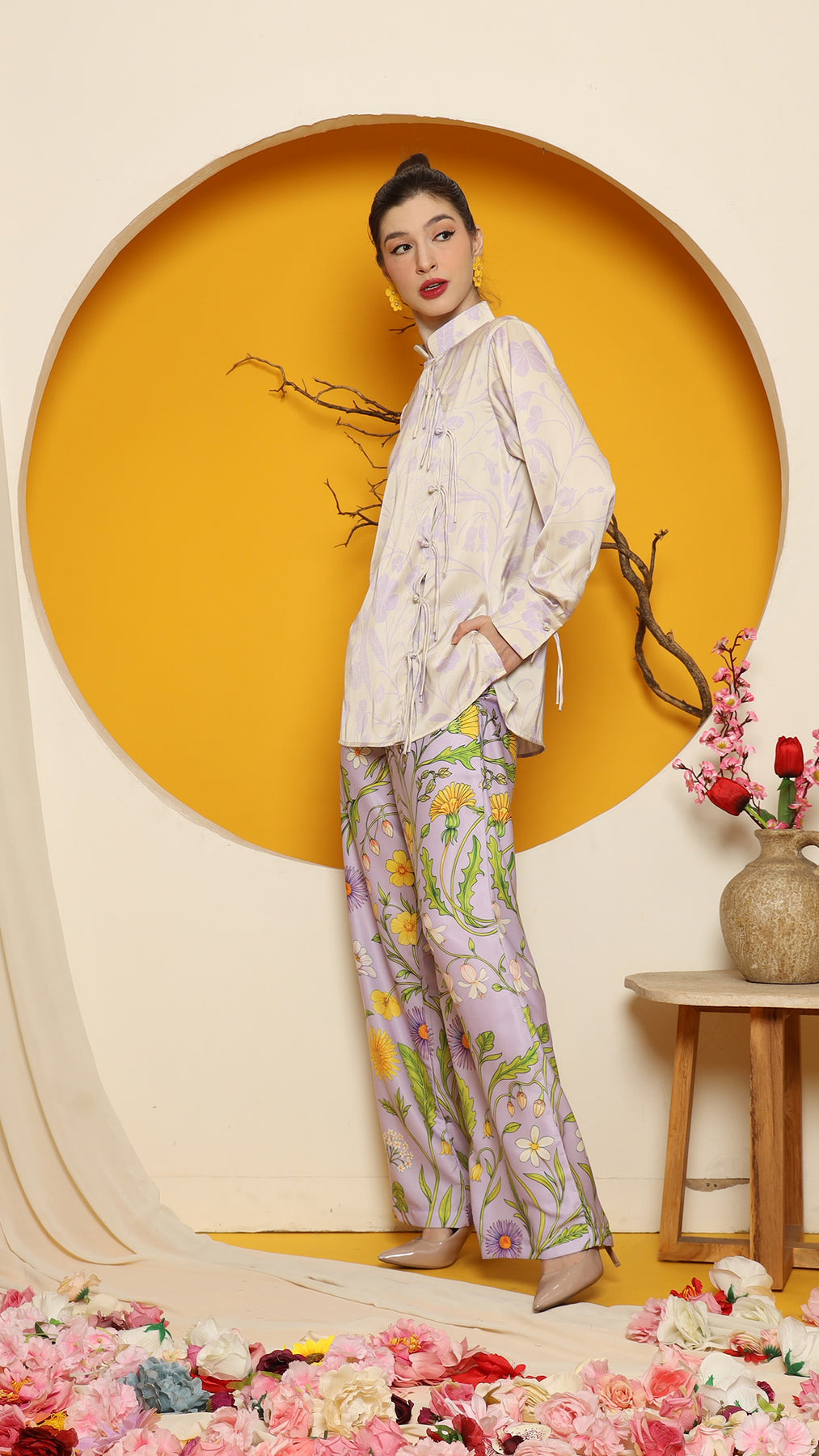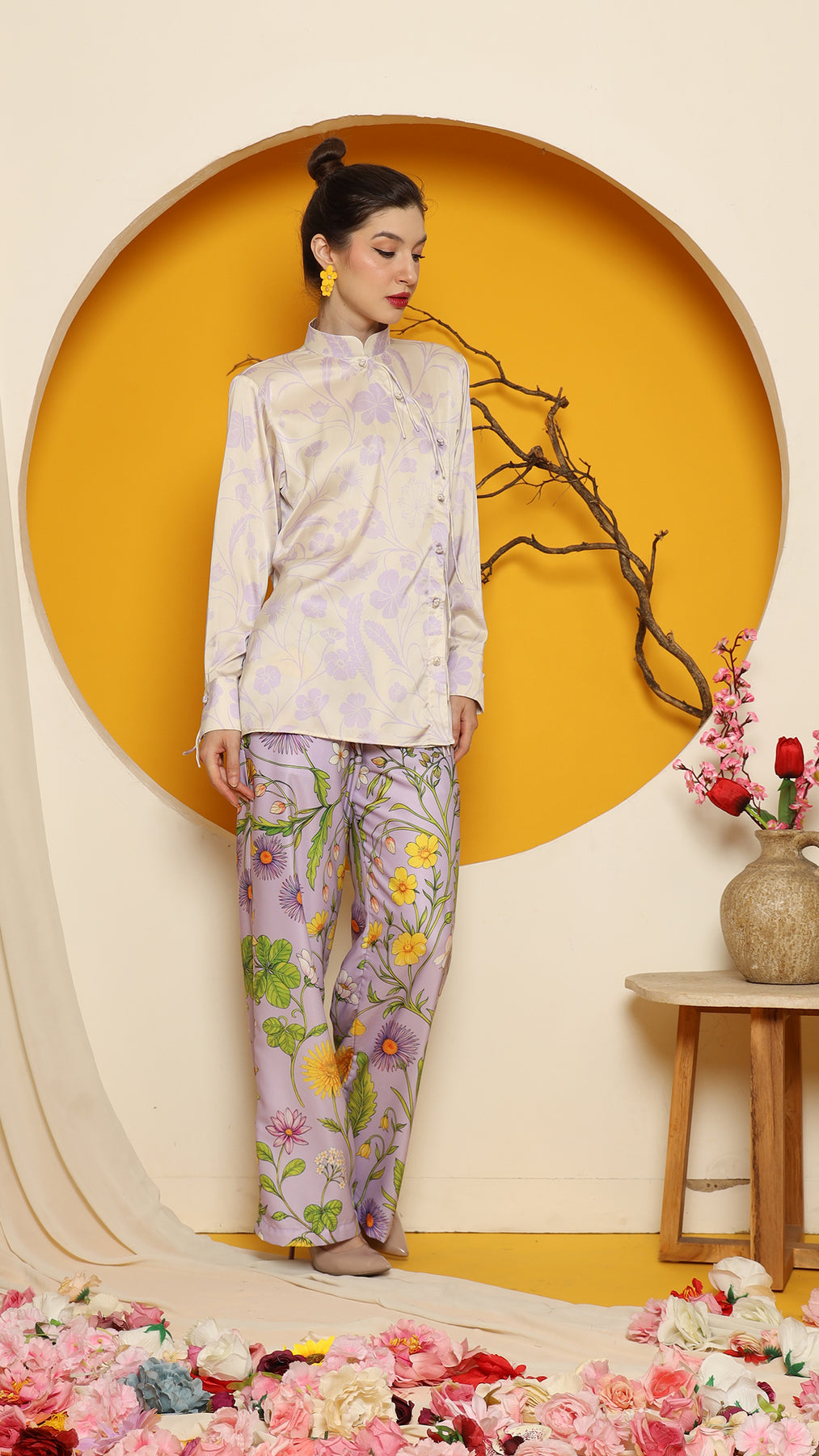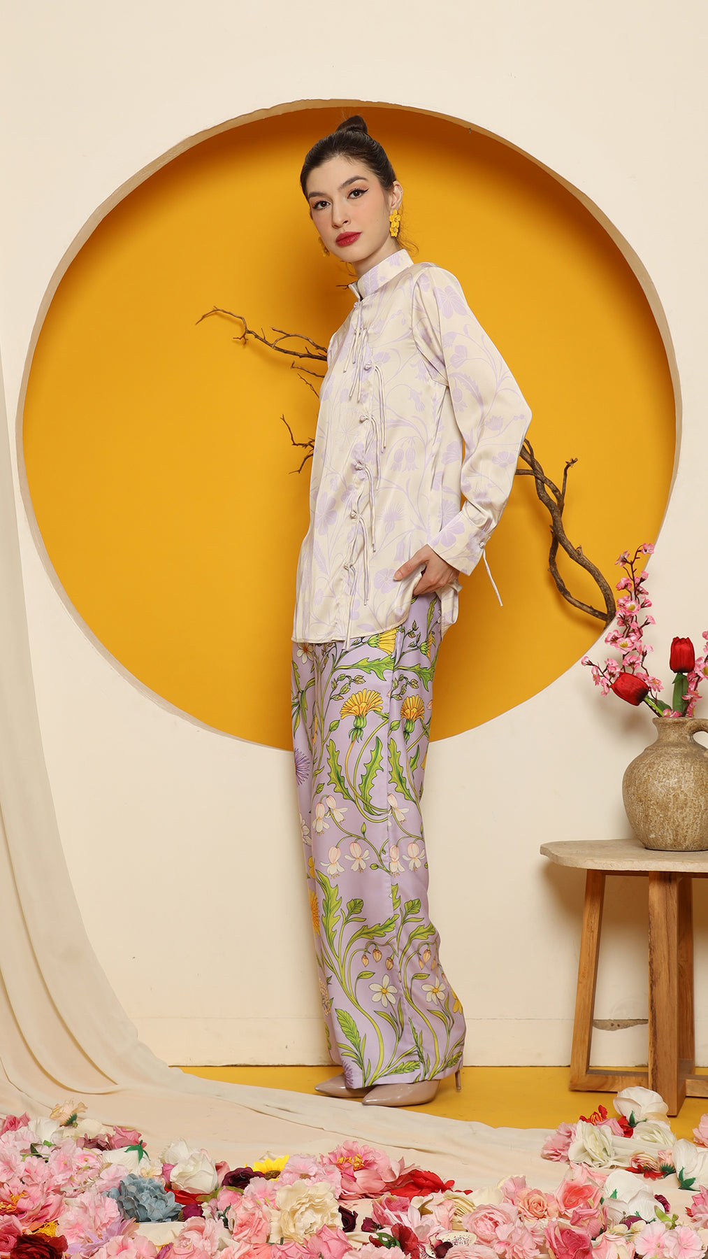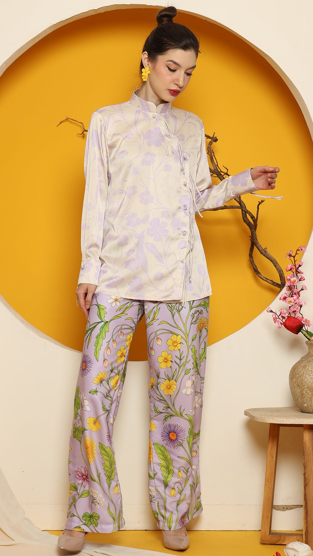 This refined ensemble includes cheongsam long top, showcasing an elegant flower motif. The shirt features a clean, minimalistic design perfect for a timeless look. Paired with it is a premium satin pants adorned with floral patterns