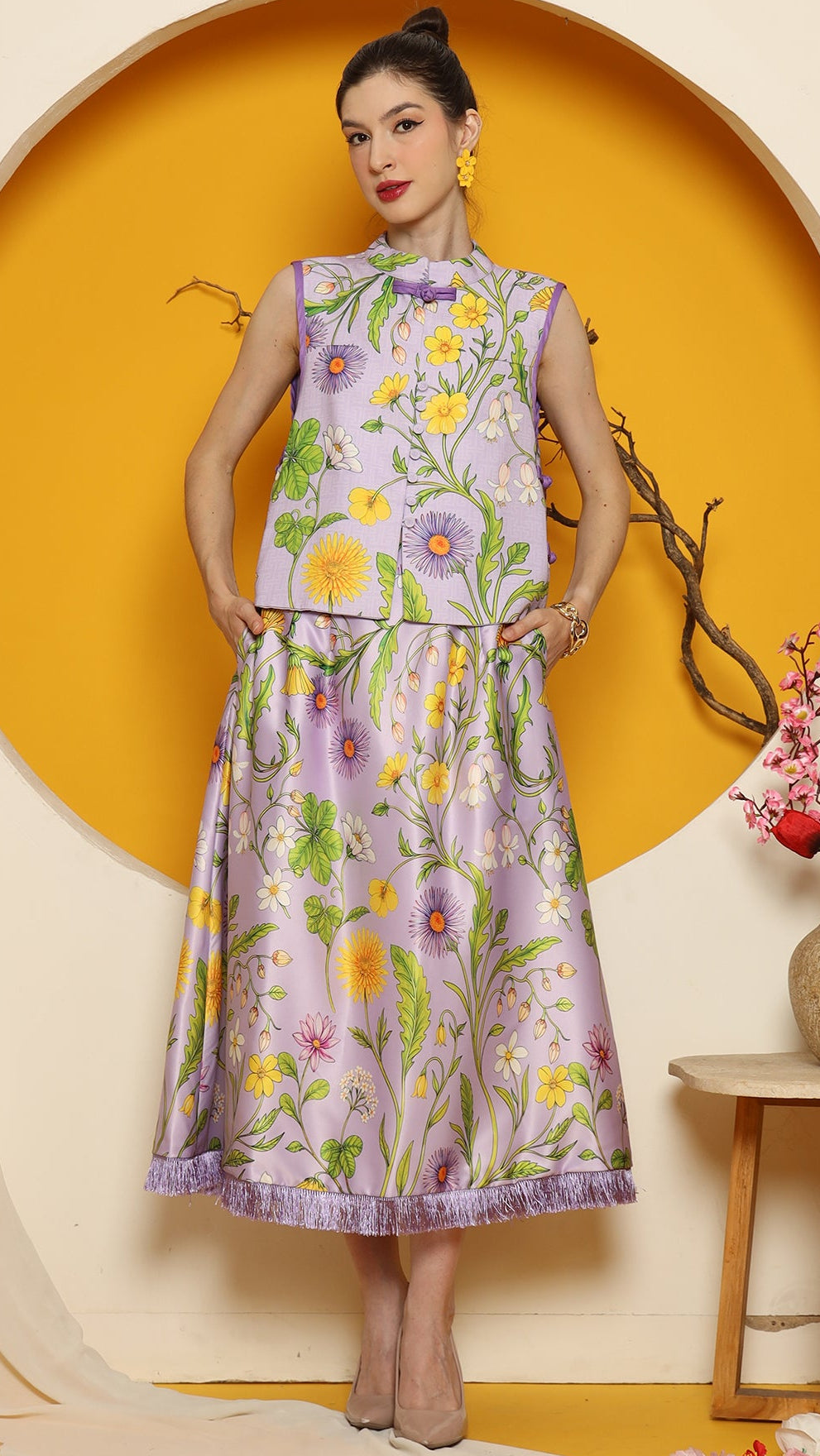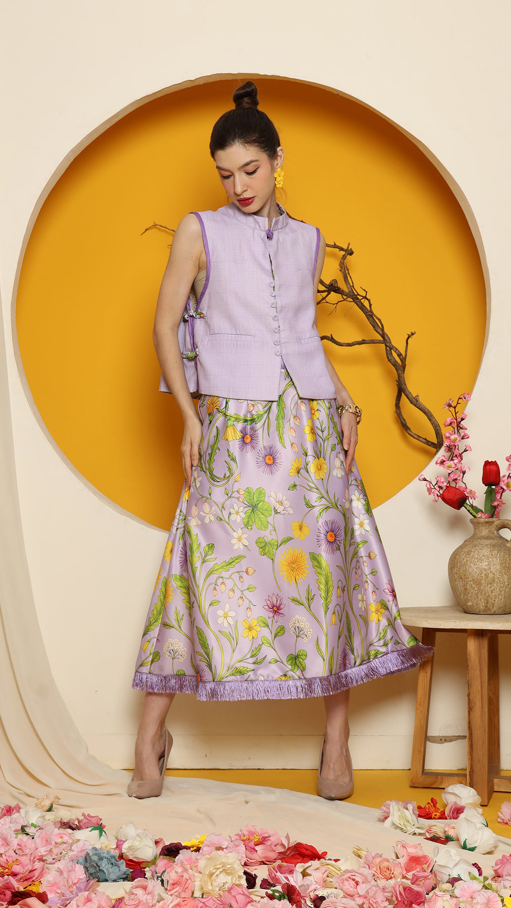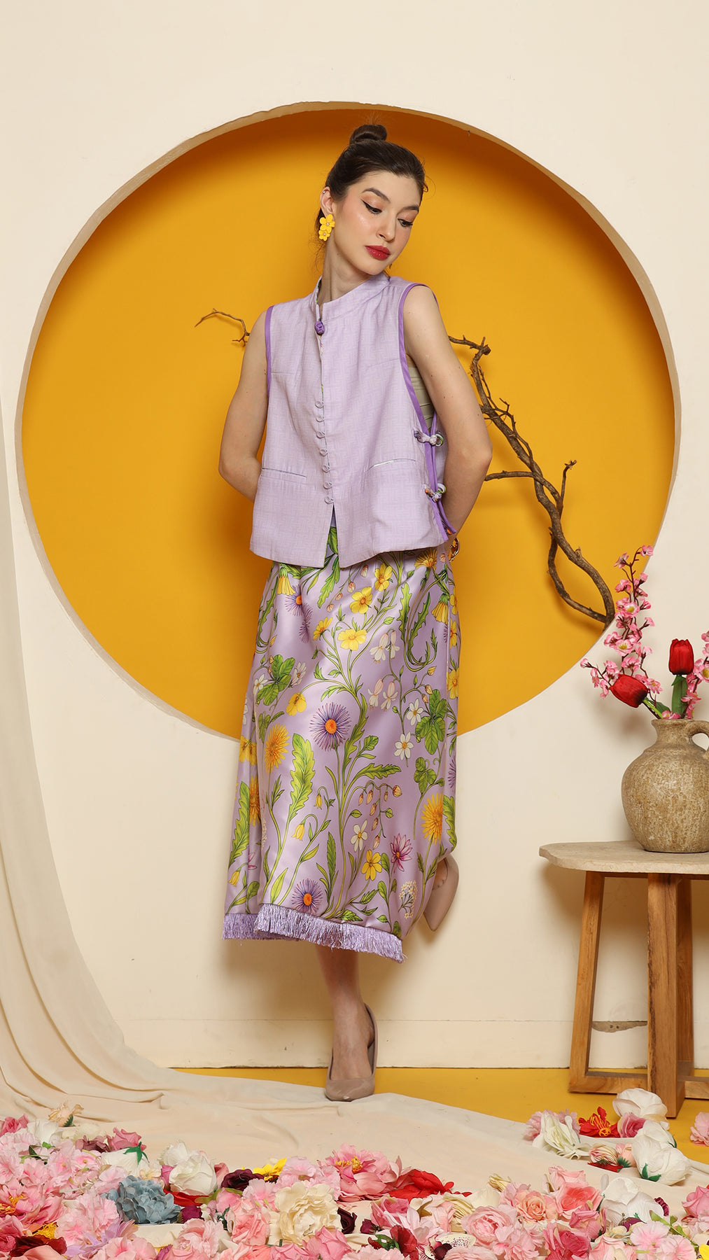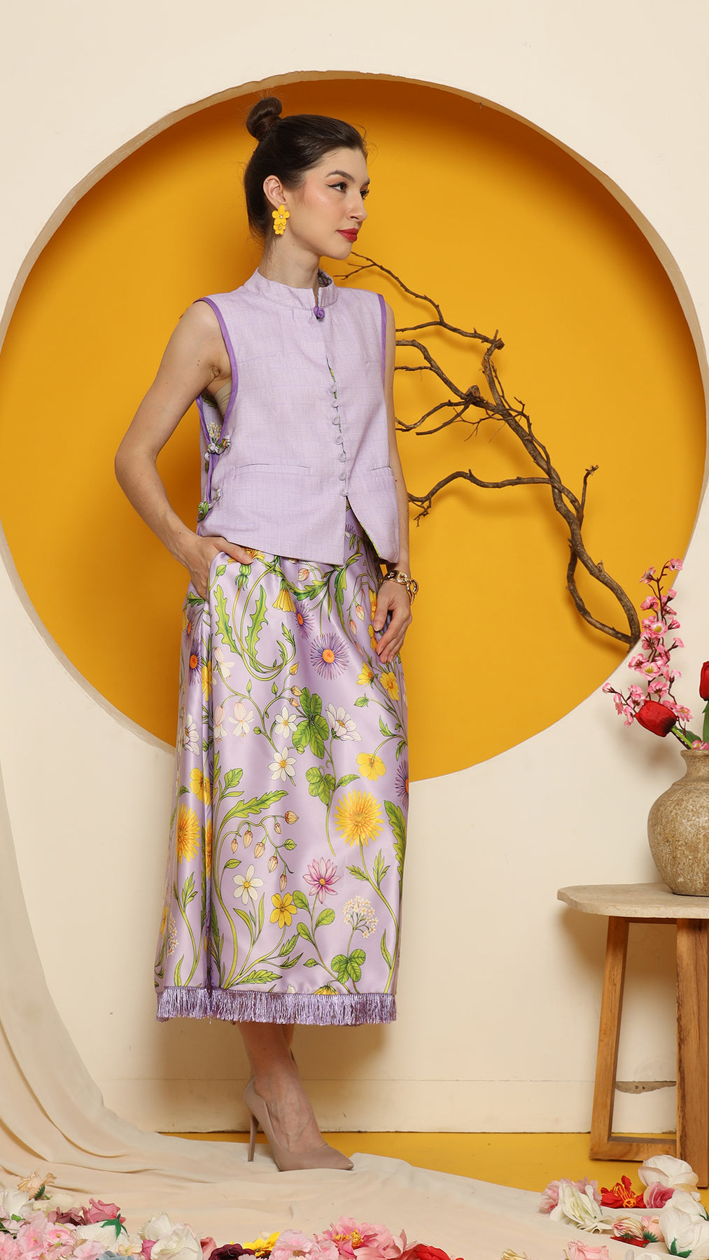 This exquisite outfit features a sleeveless satin vest with intricate floral prints, paired with skirt and pants. The soft blue tones and vibrant red floral accents create a sophisticated and timeless look. The vest is designed with a mandarin collar and detailed front and side button closures, adding an elegant touch. Paired with a classic white Chongsam shirt, this outfit blends tradition with modern style. Ideal for cultural events, formal gatherings, or making a unique fashion statement, this set embodies both grace and contemporary elegance.