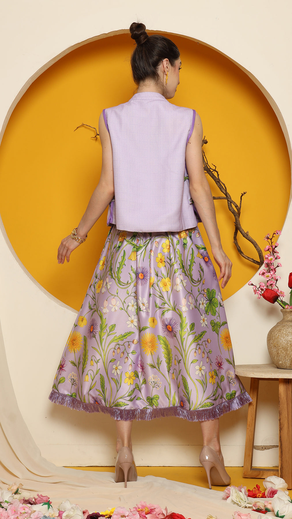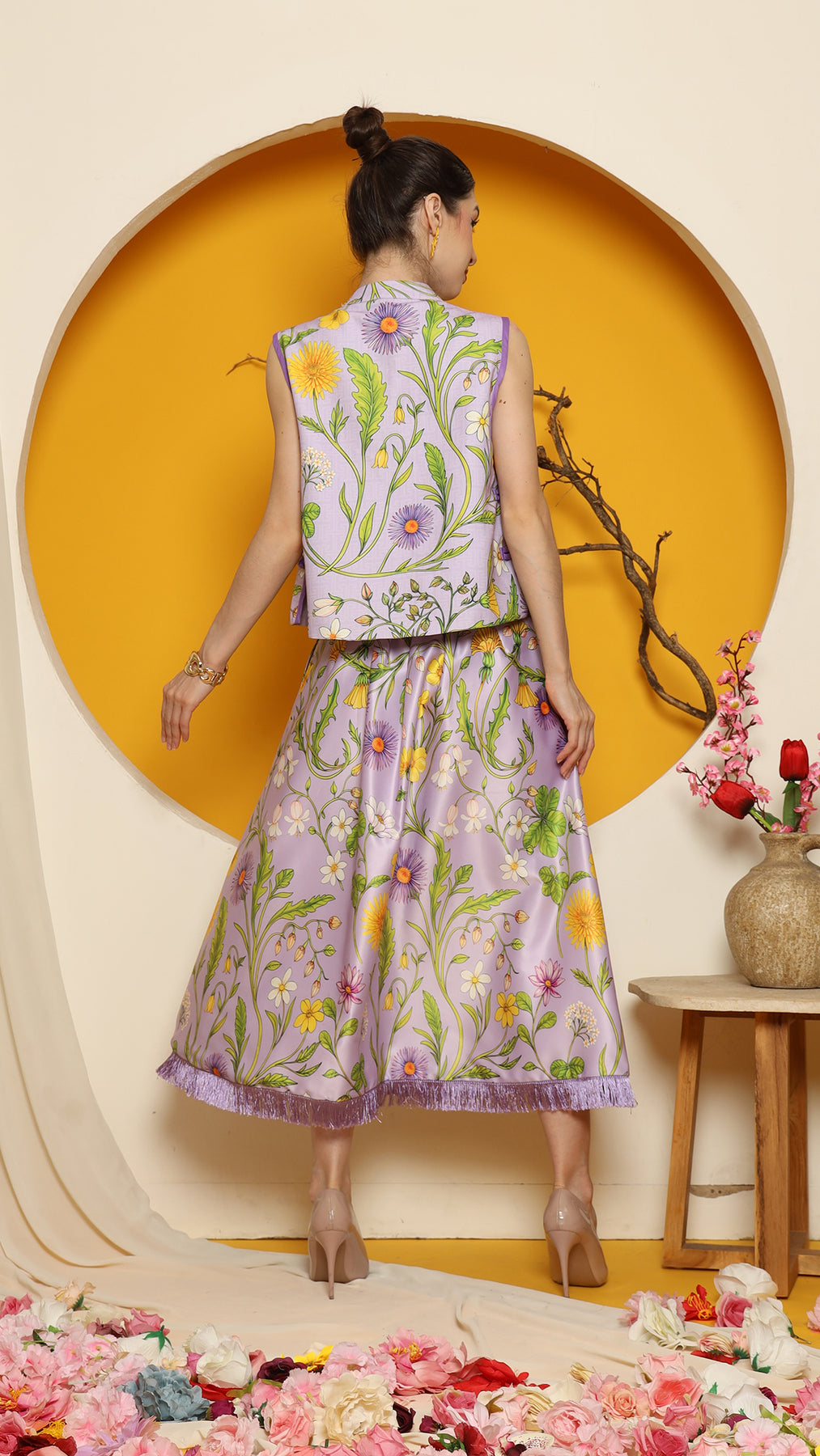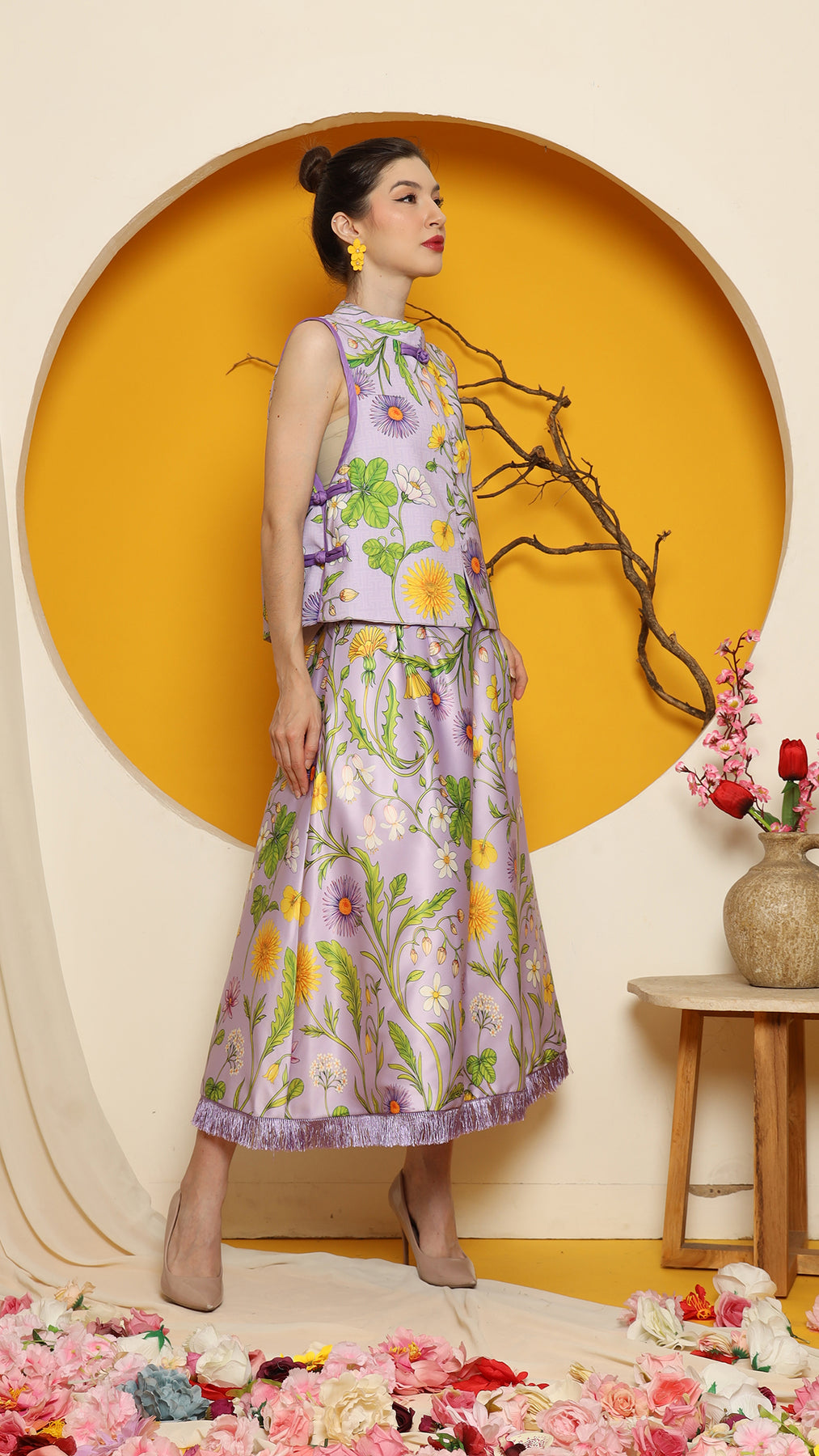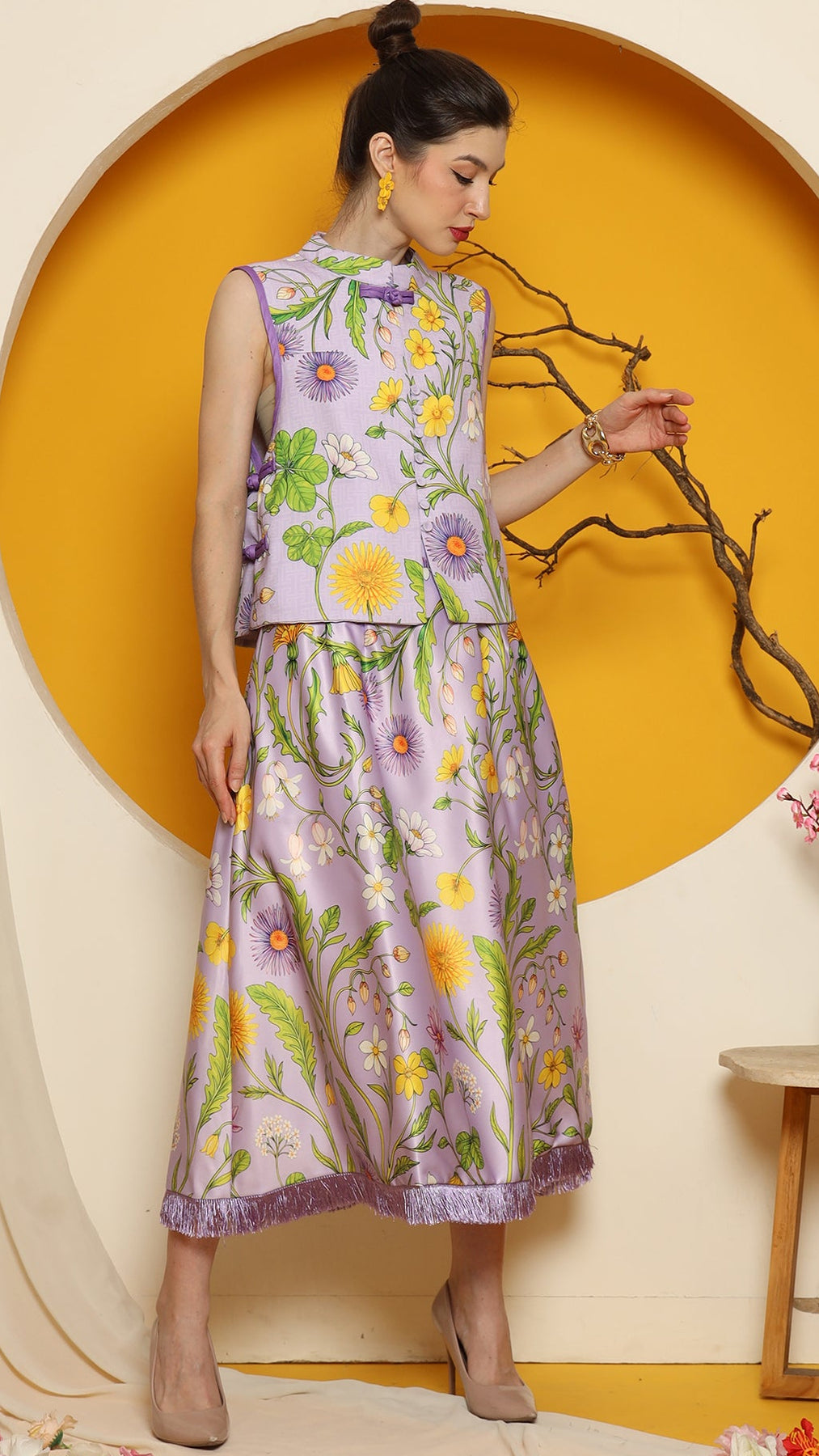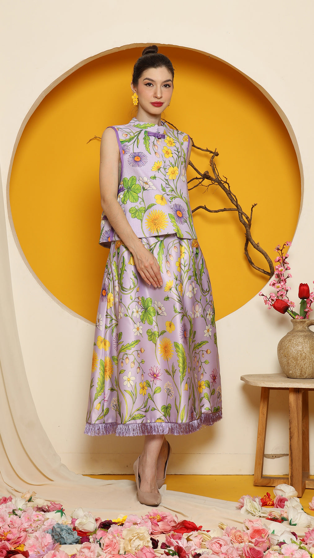 This exquisite outfit features a sleeveless satin vest with intricate floral prints, paired with skirt and pants. The soft blue tones and vibrant red floral accents create a sophisticated and timeless look. The vest is designed with a mandarin collar and detailed front and side button closures, adding an elegant touch. Paired with a classic white Chongsam shirt, this outfit blends tradition with modern style. Ideal for cultural events, formal gatherings, or making a unique fashion statement, this set embodies both grace and contemporary elegance.