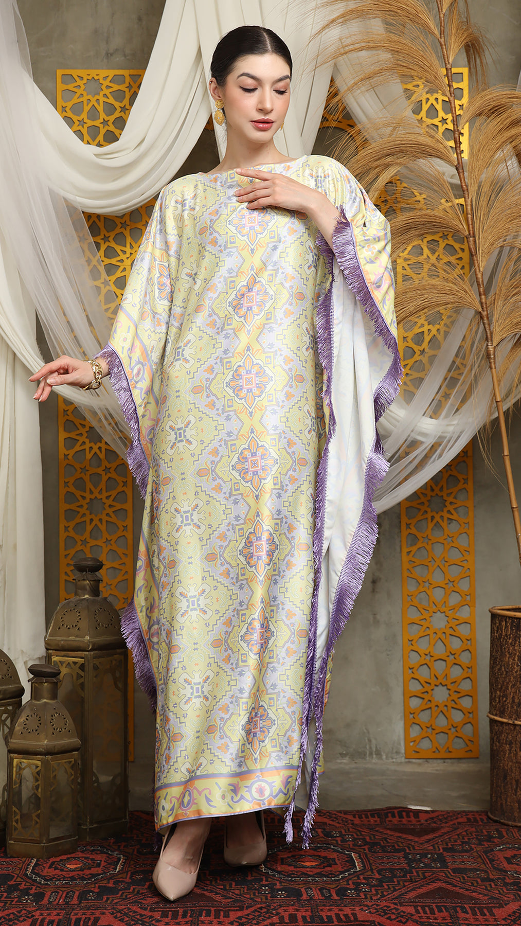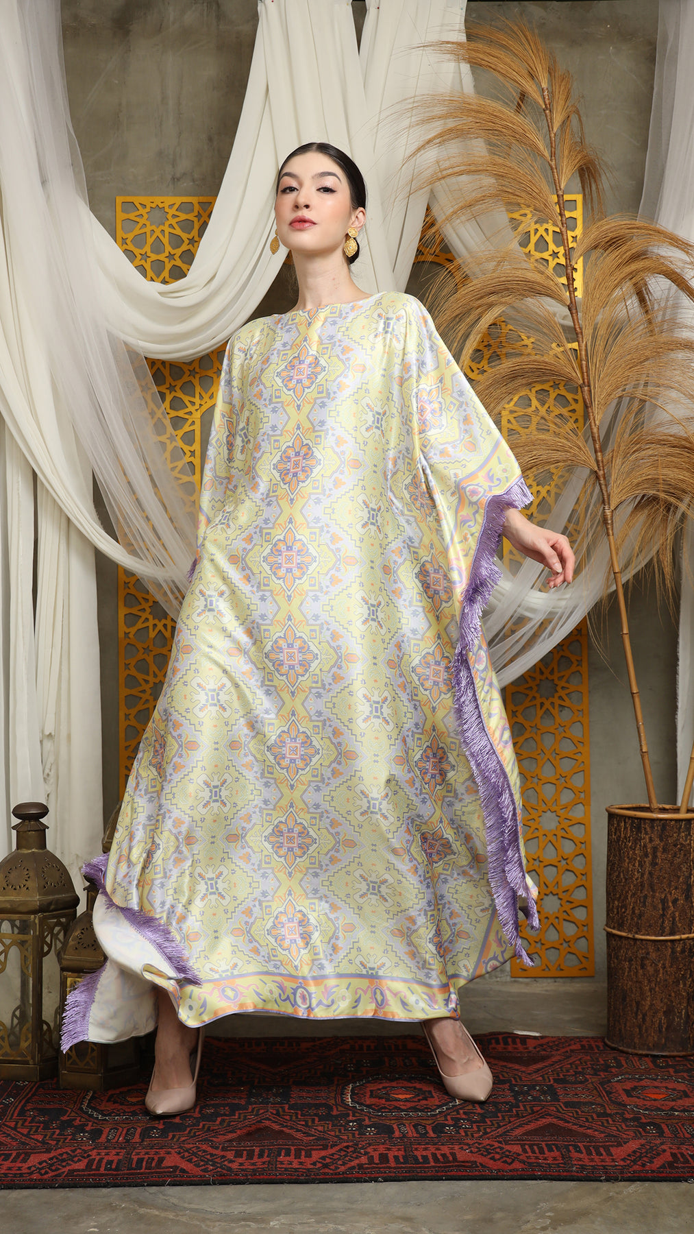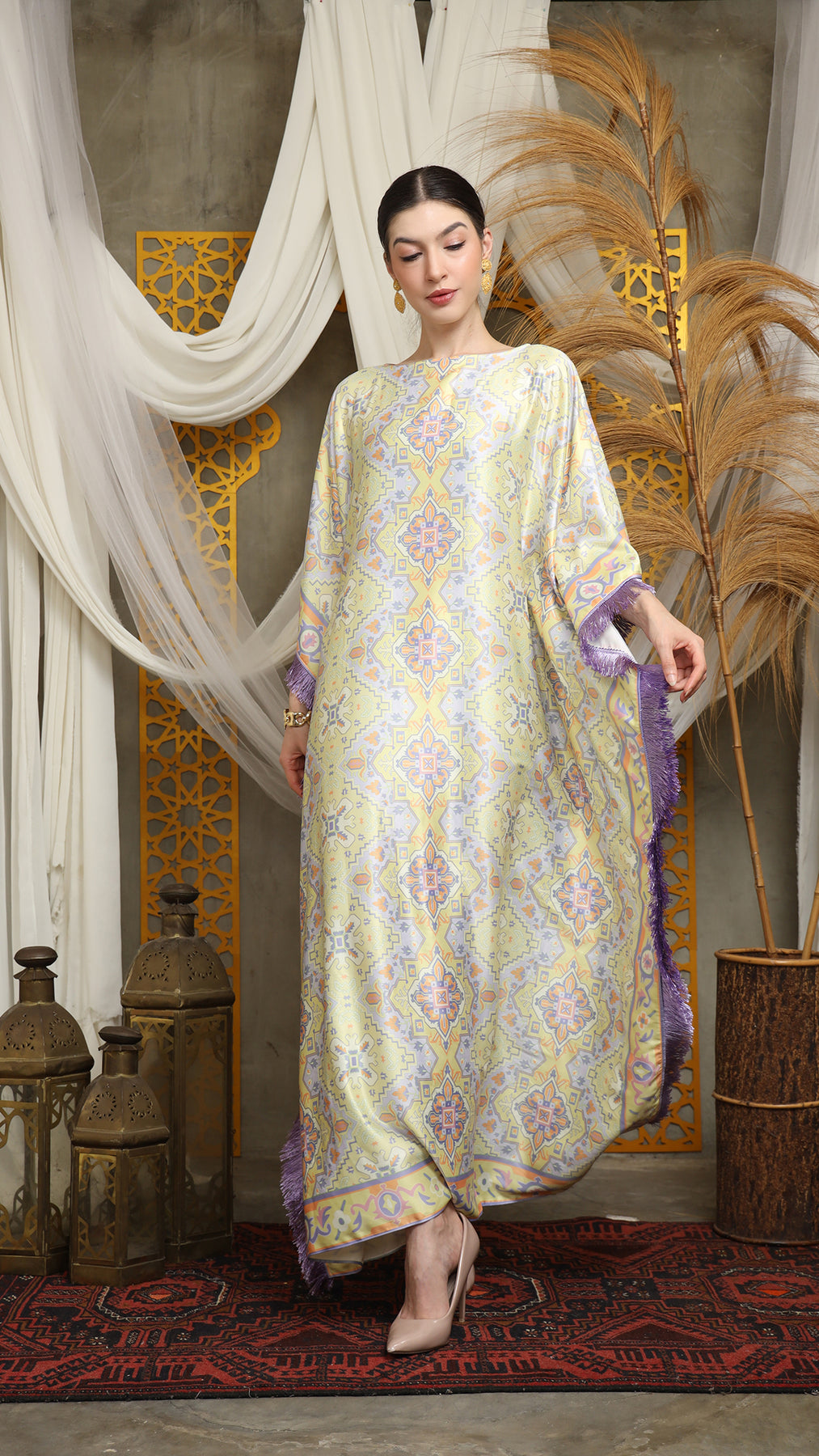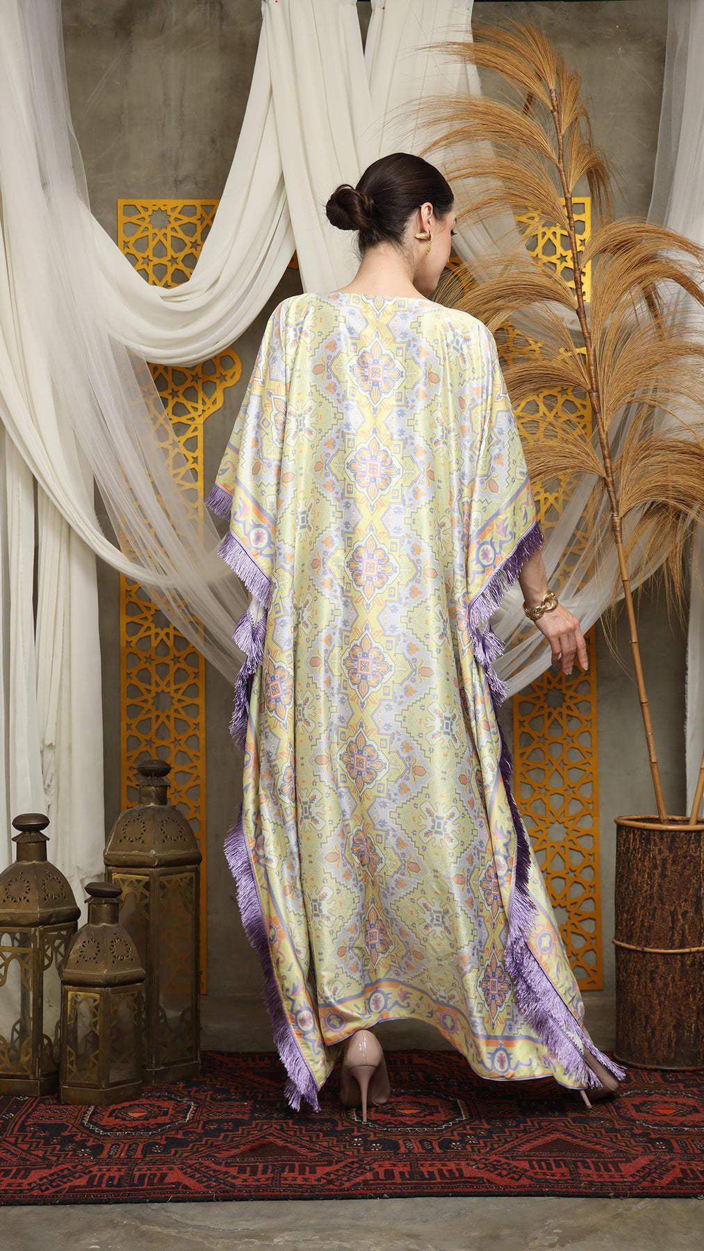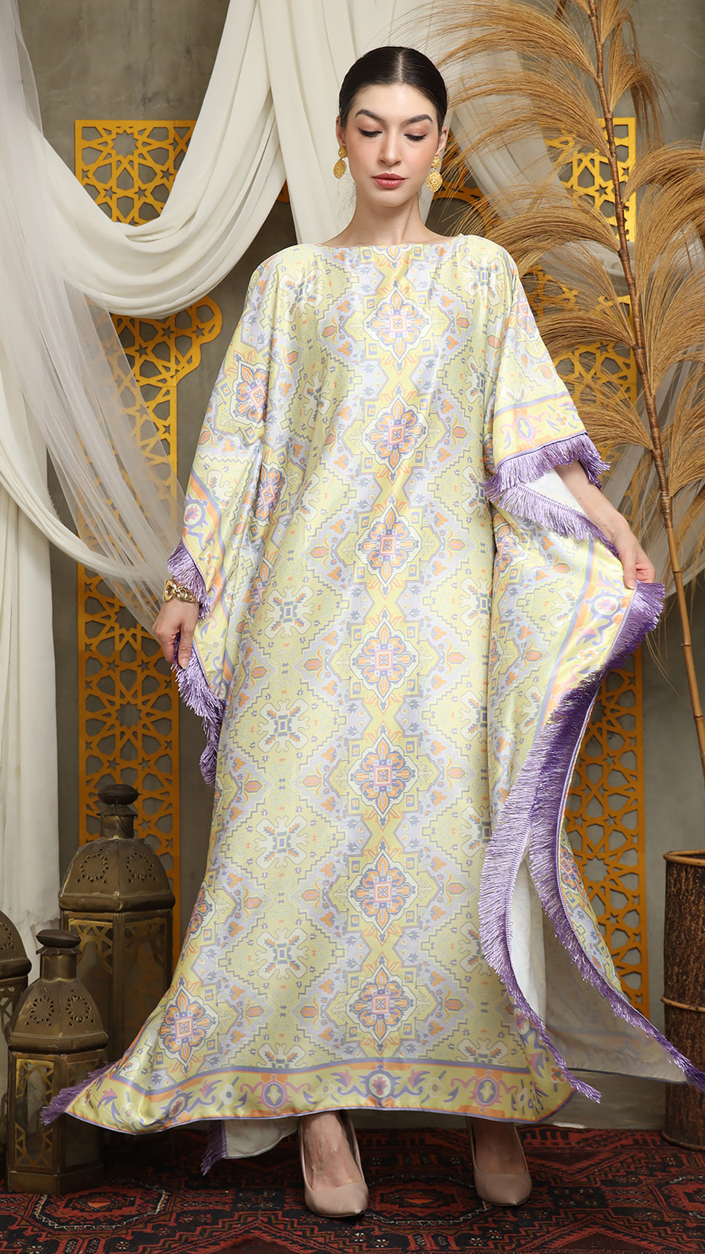 This kaftan is made from premium satin material, which has super comfortable to lounge around in, adjustable drawstring, and flattering neckline is an added feature which offers a glamorous way to cover up and perfect for evening wear. A short fringe kaftan that brings effortless drama and easy elegance. Cut in a relaxed, breezy silhouette, it drapes beautifully over the body while allowing freedom of movement. The playful fringe detailing adds texture and motion, swaying with every step for a touch of bohemian glamour