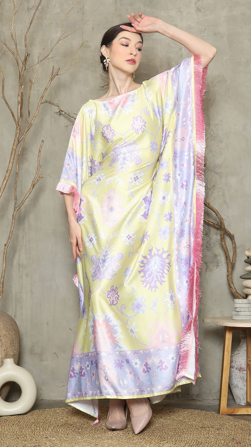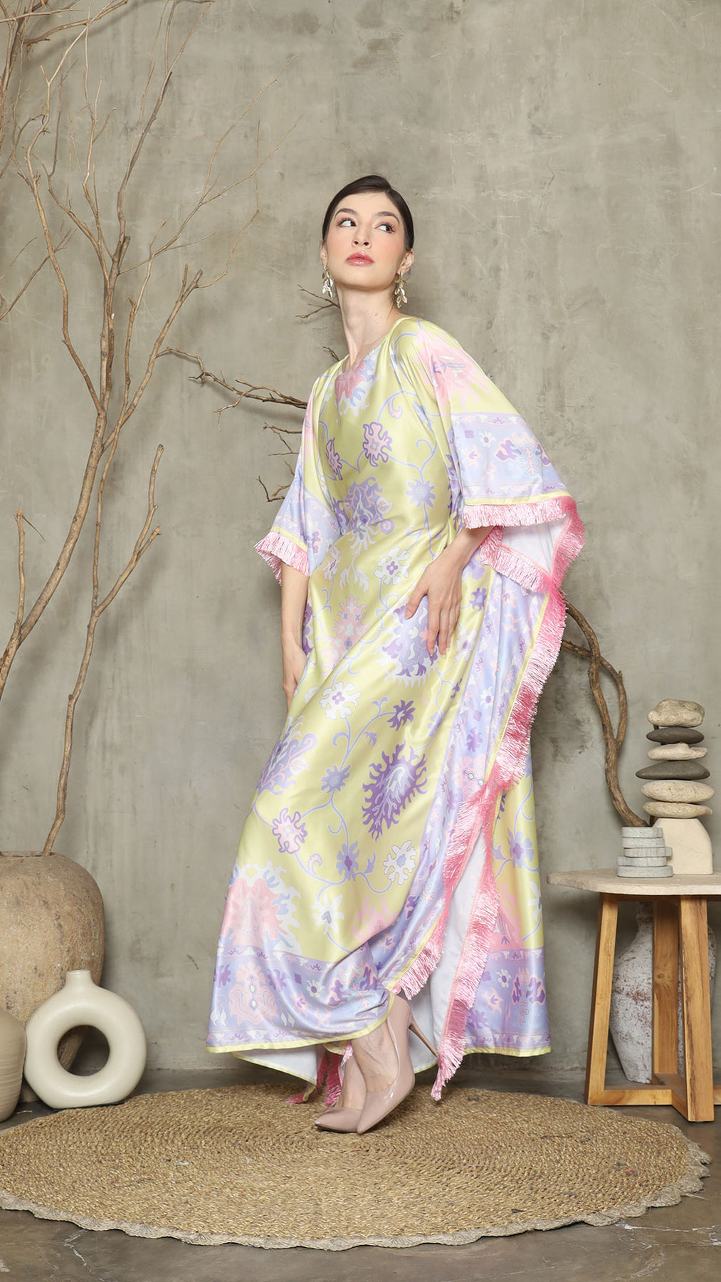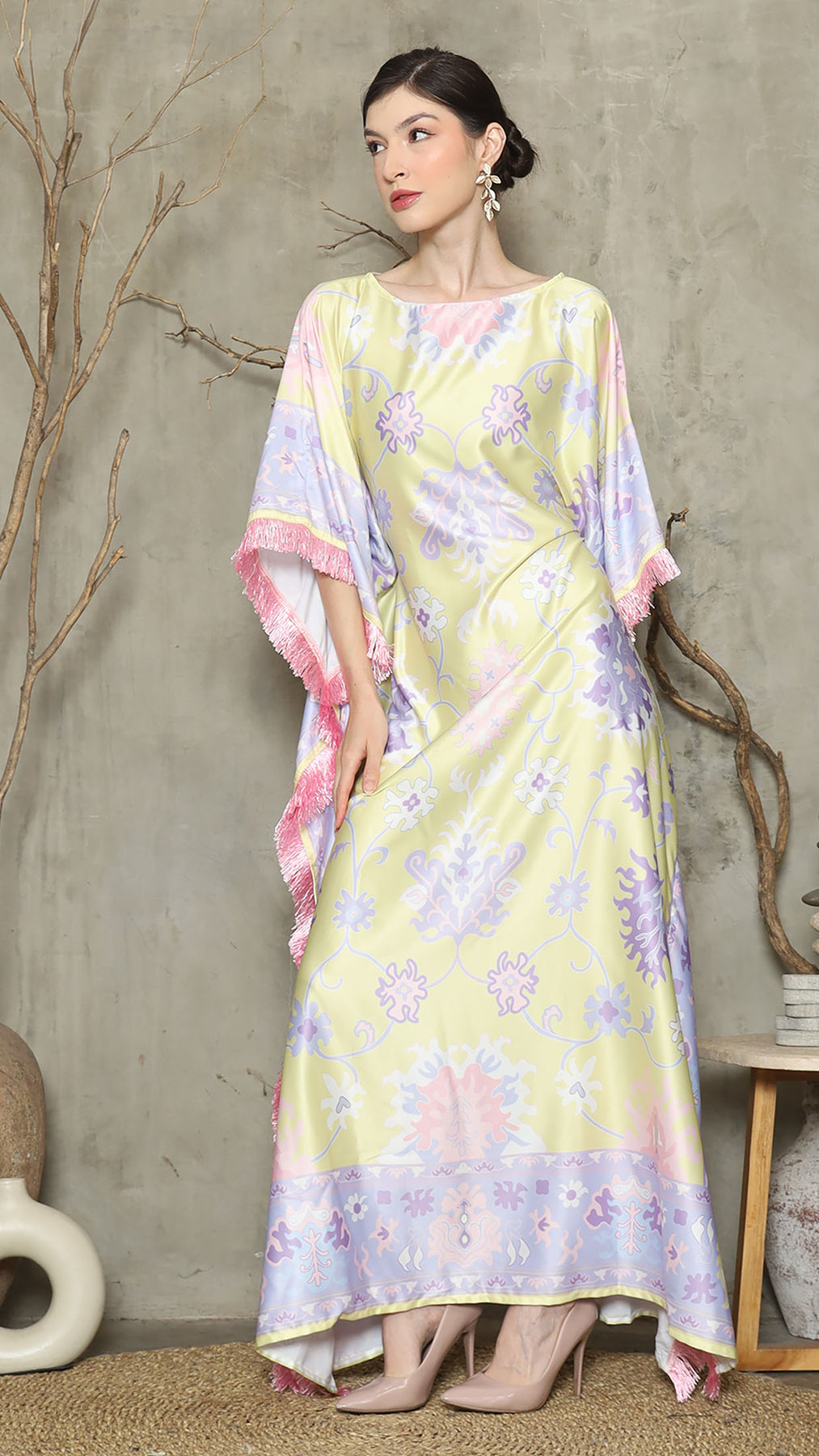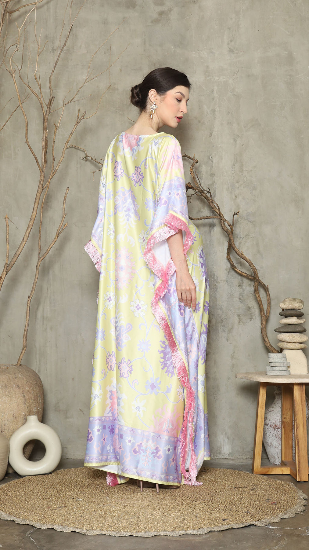 This kaftan is made from premium satin material, which has super comfortable to lounge around in, adjustable drawstring, and flattering neckline is an added feature which offers a glamorous way to cover up and perfect for evening wear. A short fringe kaftan that brings effortless drama and easy elegance. Cut in a relaxed, breezy silhouette, it drapes beautifully over the body while allowing freedom of movement. The playful fringe detailing adds texture and motion, swaying with every step for a touch of bohemian glamour