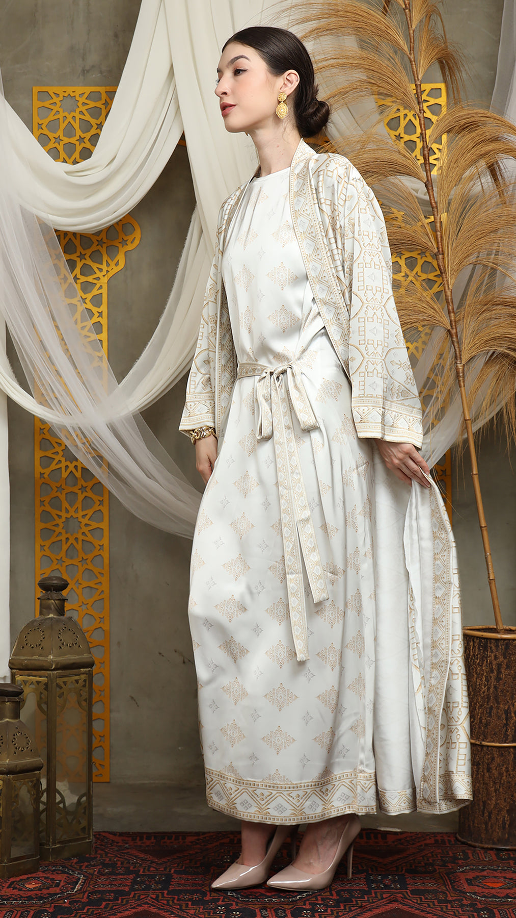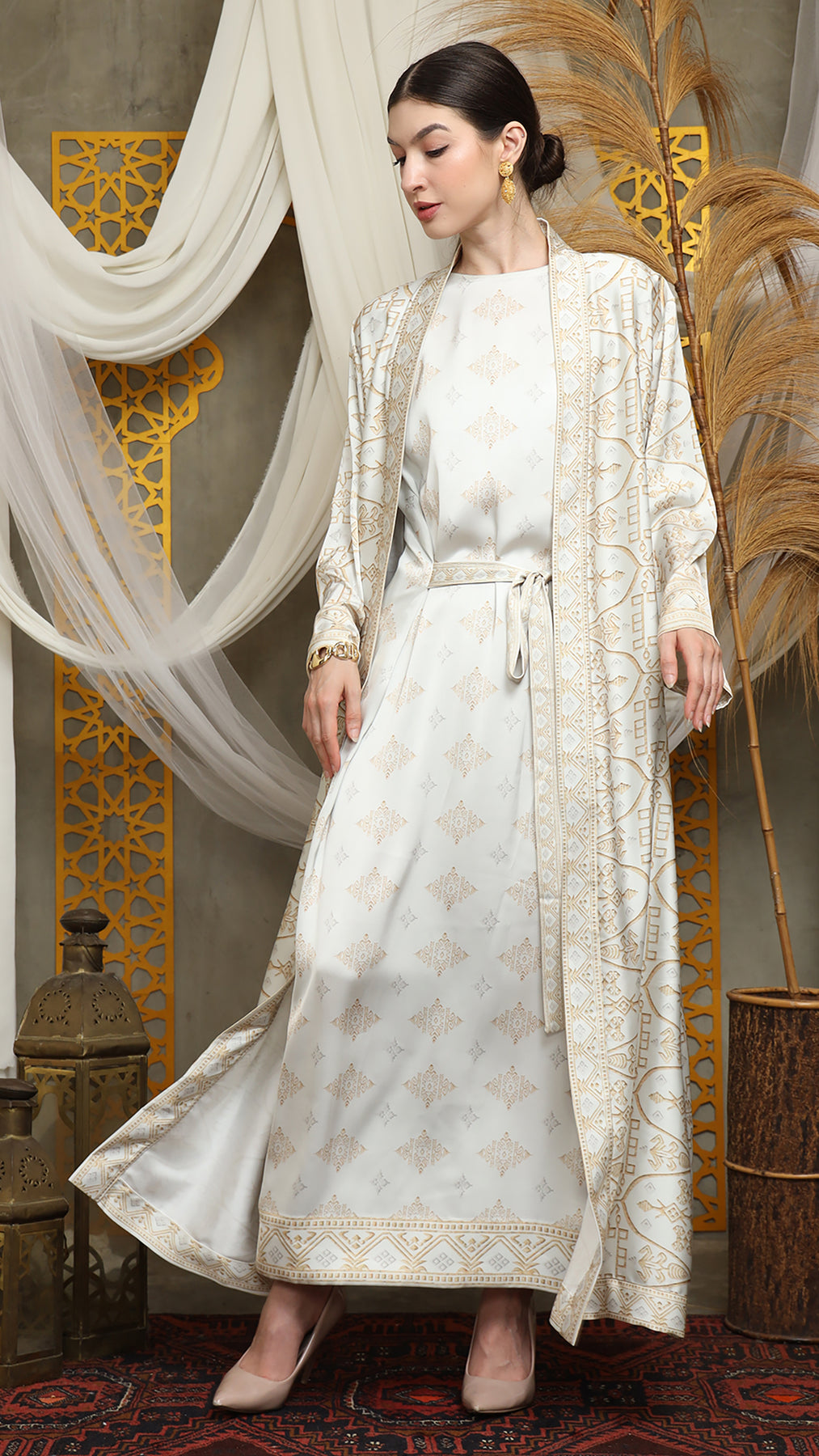 Outerwear is crafted from premium satin. It comes as a 2-piece set: an outer layer and an inner layer. The inner piece features a beautiful patterned design with a back button for added charm. Elegant and versatile, it’s perfect for any occasion, offering a timeless blend of sophistication and comfort.