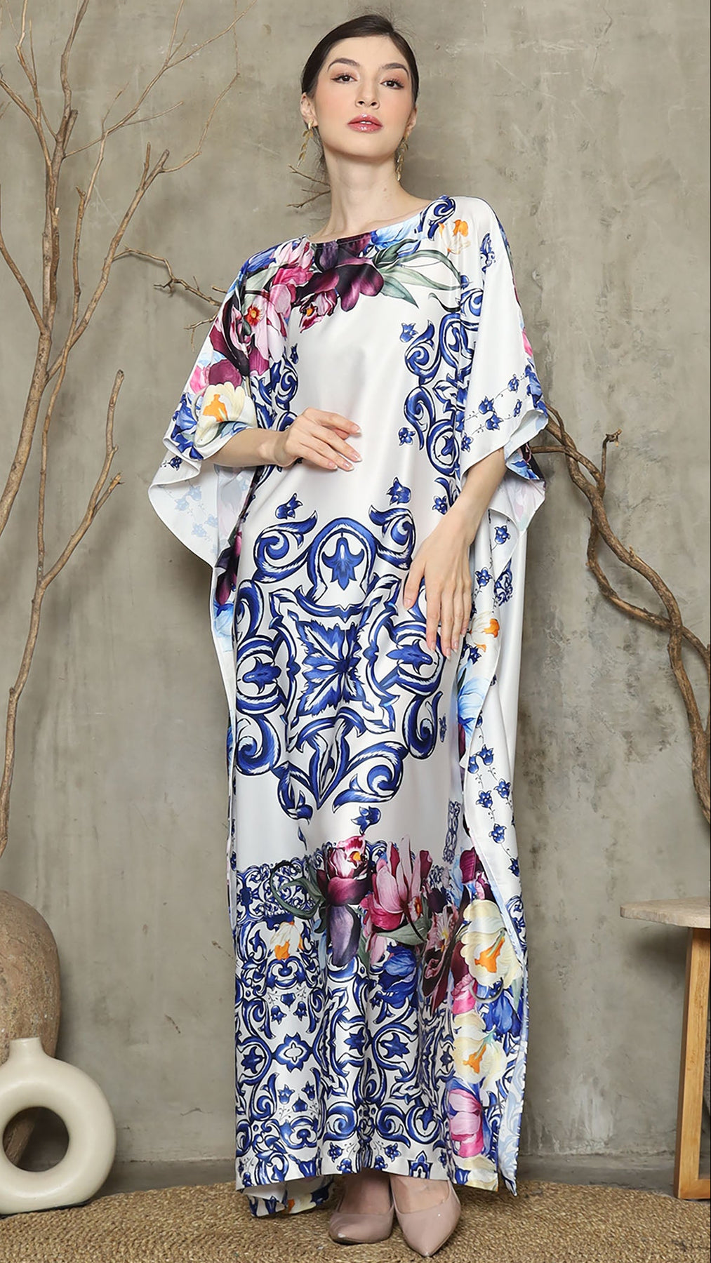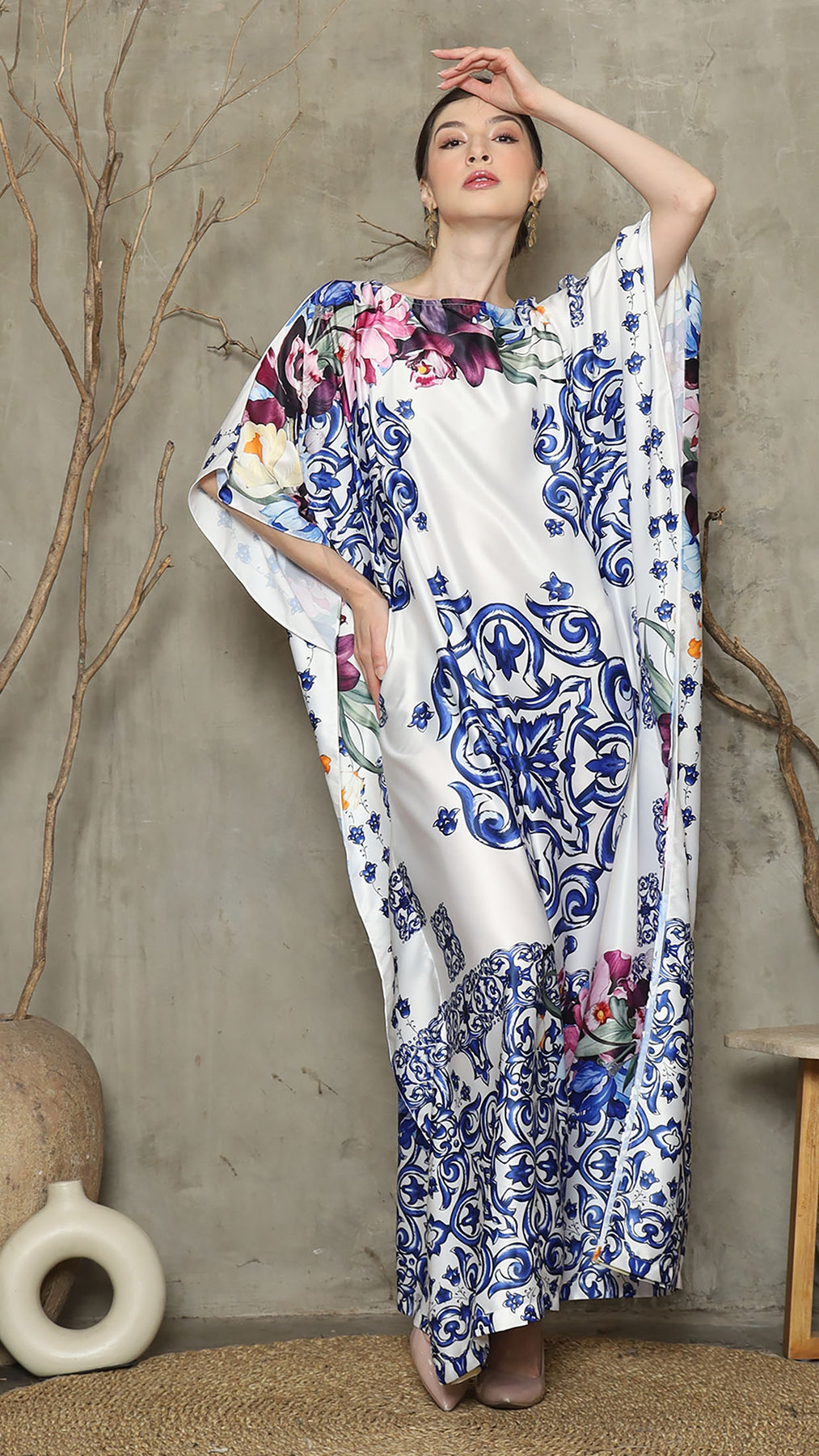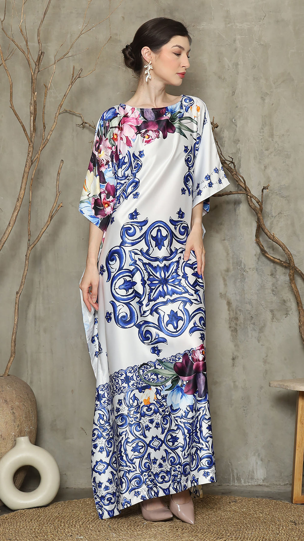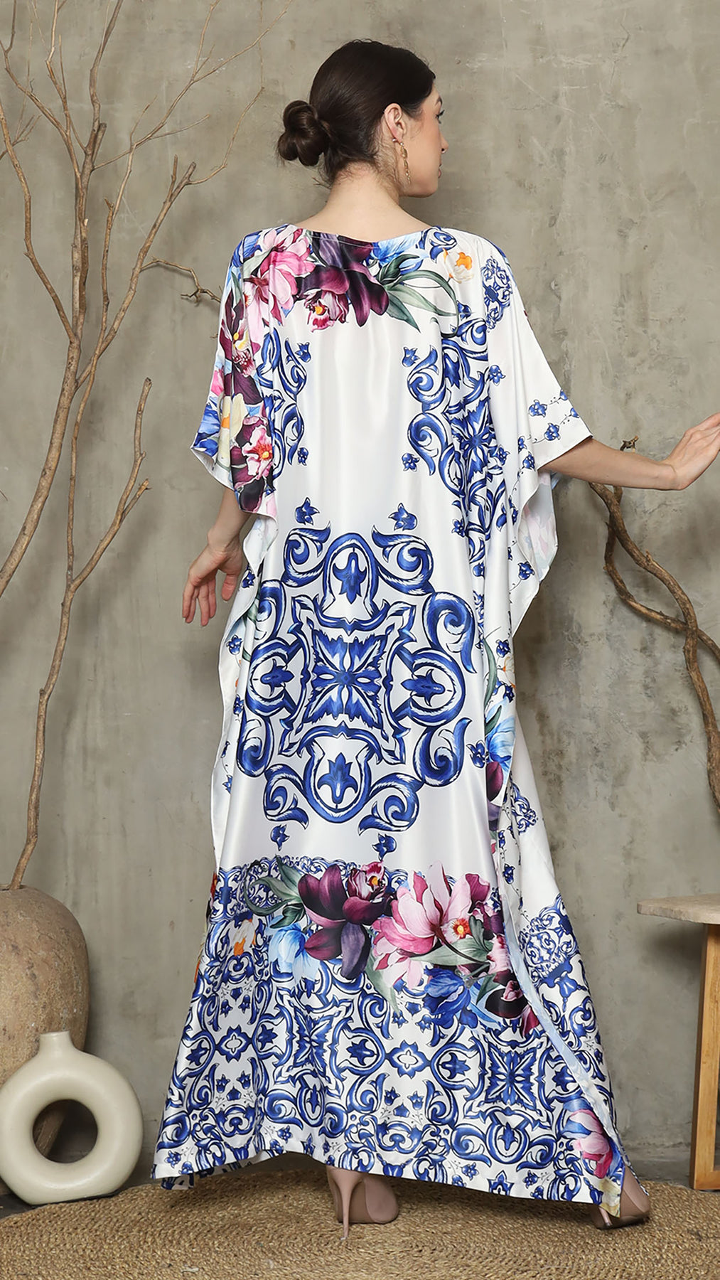 This kaftan is made from lightweight satin material, which has super comfortable to lounge around in, adjustable drawstring and flattering neckline is an added feature which offers a glamorous way to cover up and perfect for evening wear.
