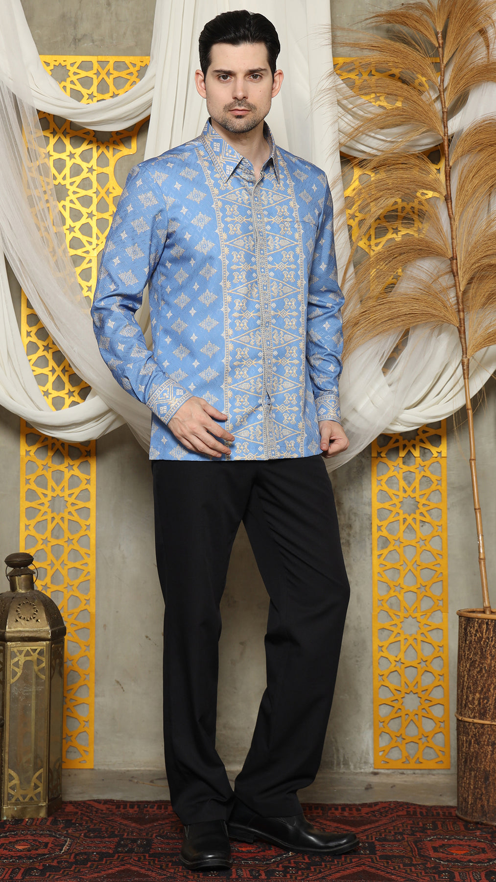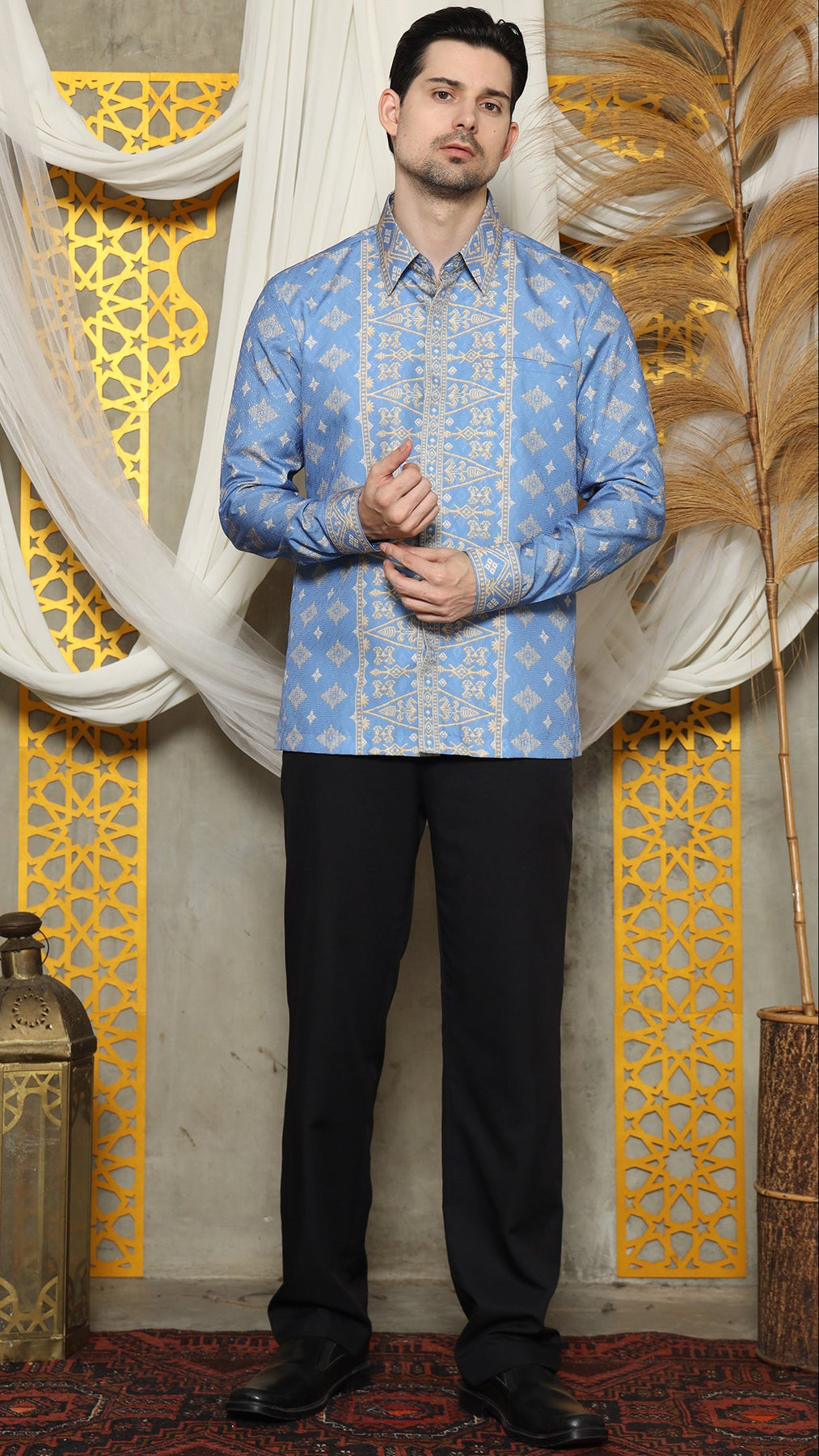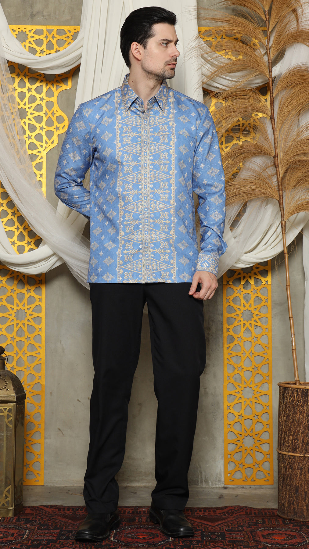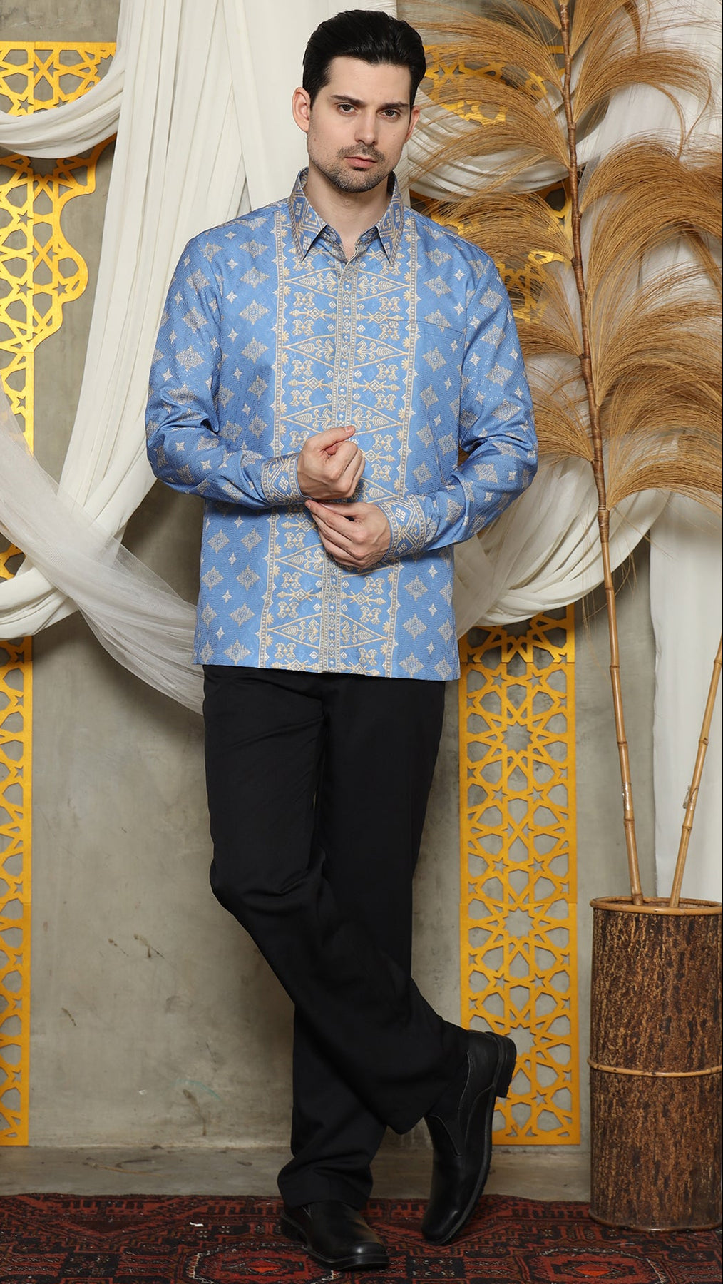 The Bali Shirt printed was inspired by the art of Indonesian rich Bali tradition is made from Satin material. Imagine intricate patterns inspired by cultural heritage delicately adorning a crisp shirt, seamlessly merging tradition with modern fashion.